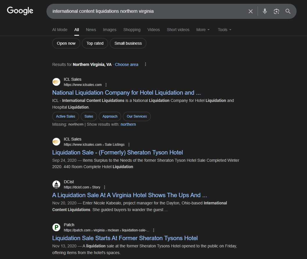 Hmm, this one is a bit harder. It’s some abandoned building again. The first image shows a large hallway with multiple columns. The second image shows a piece of paper that says “STOP! This area not open for liquidation”, a phone number “470-277-3666”, and at the bottom text that reads “ICL/International Content Liquidations, INC.” My first instinct was to search up the company, which gave me these results:
